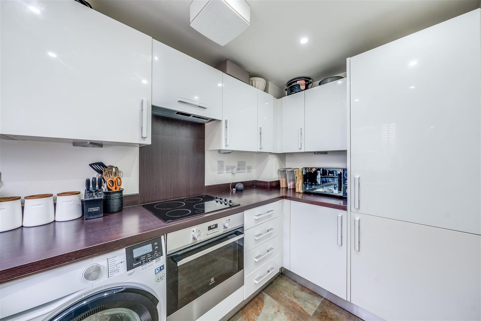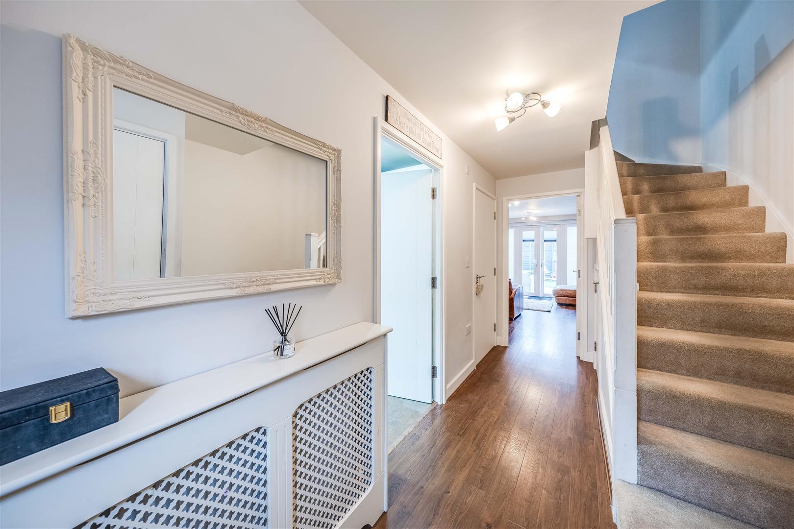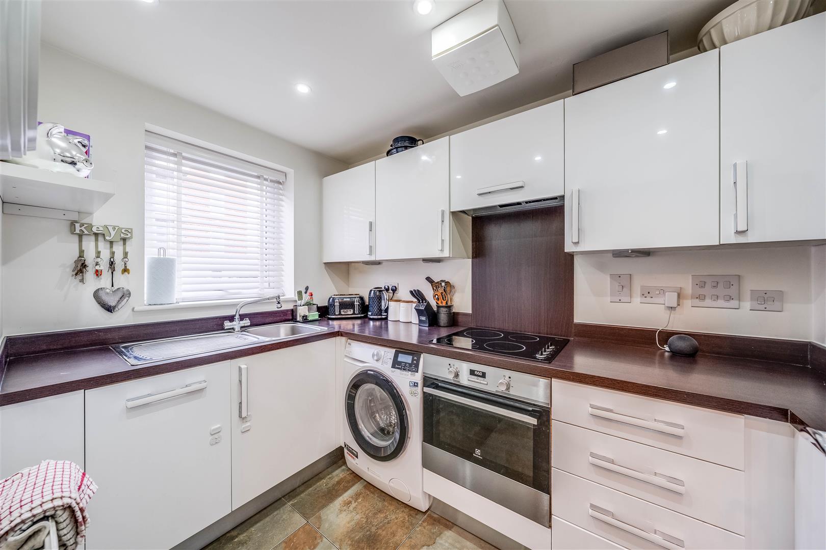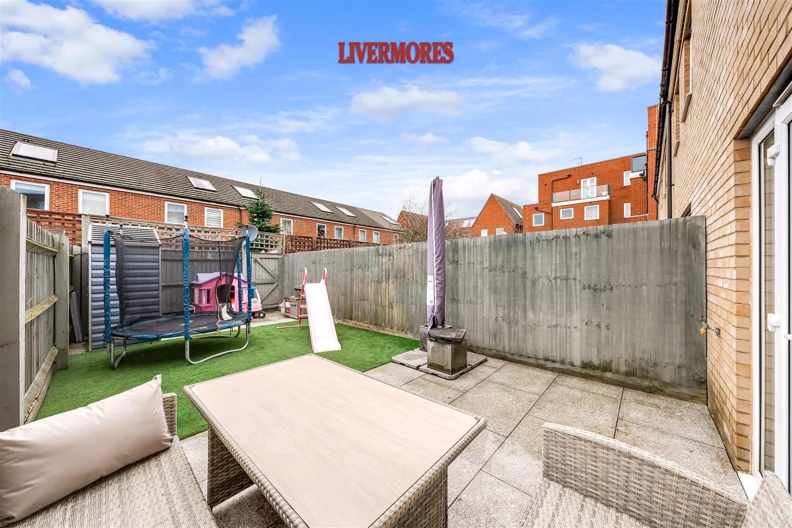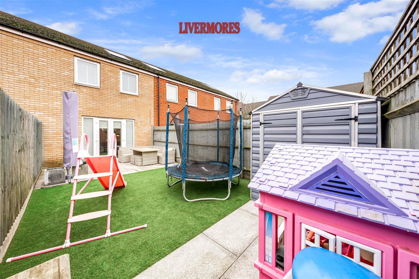 The property features a separate kitchen at the front, fitted with sleek high-gloss cabinets, integrated appliances, and ample storage. To the rear, the spacious lounge/diner benefits from French doors leading to the private garden, which has a mix of patio and artificial lawn for easy upkeep. A downstairs W/C adds extra convenience.