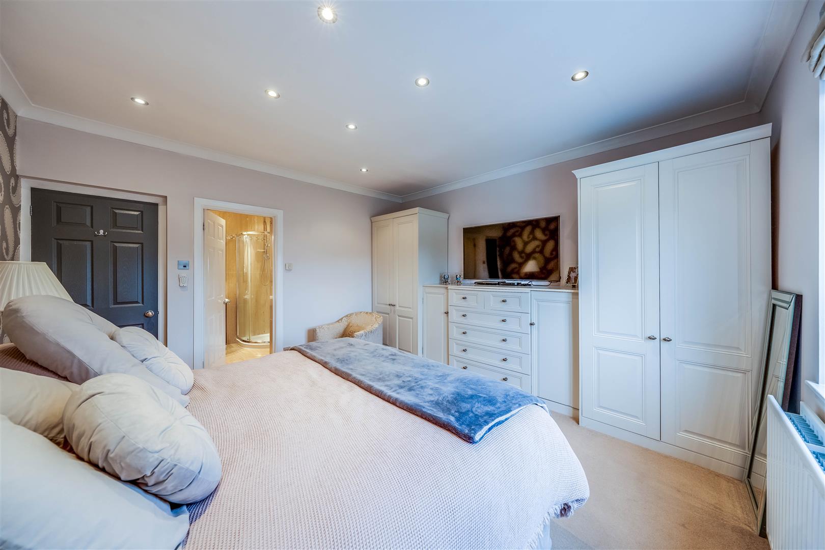 Upstairs, there are four spacious bedrooms, each thoughtfully designed to maximise comfort. The principal bedroom boasts plenty of wardrobe space and a private en-suite bathroom, while the remaining bedrooms are served by a family bathroom, finished to a high standard with both a bath and a separate shower.