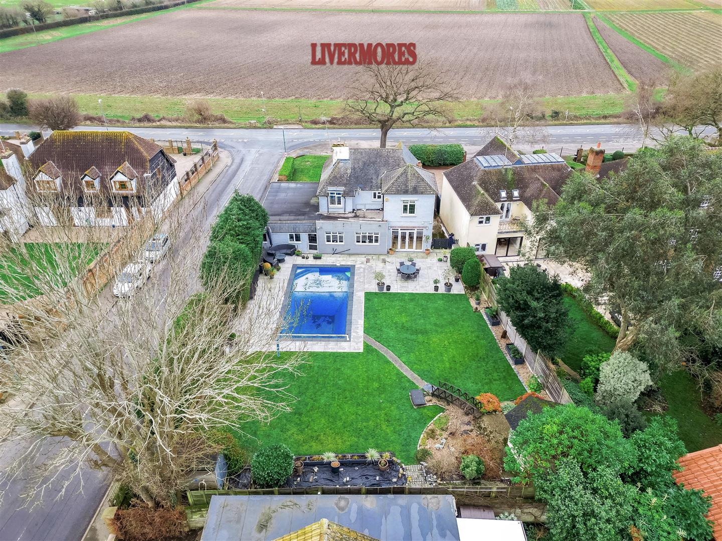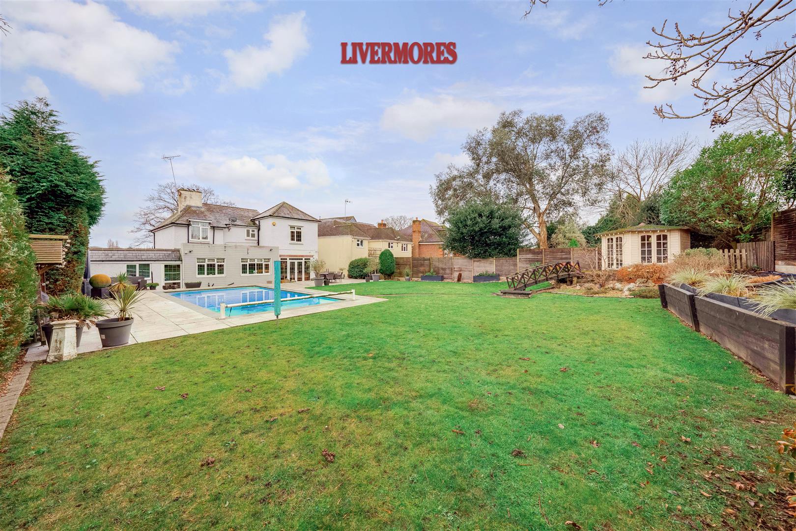 - LARGE REAR GARDEN WITH PATIO, LANDSCAPED LAWN, AND HEATED SWIMMING POOL