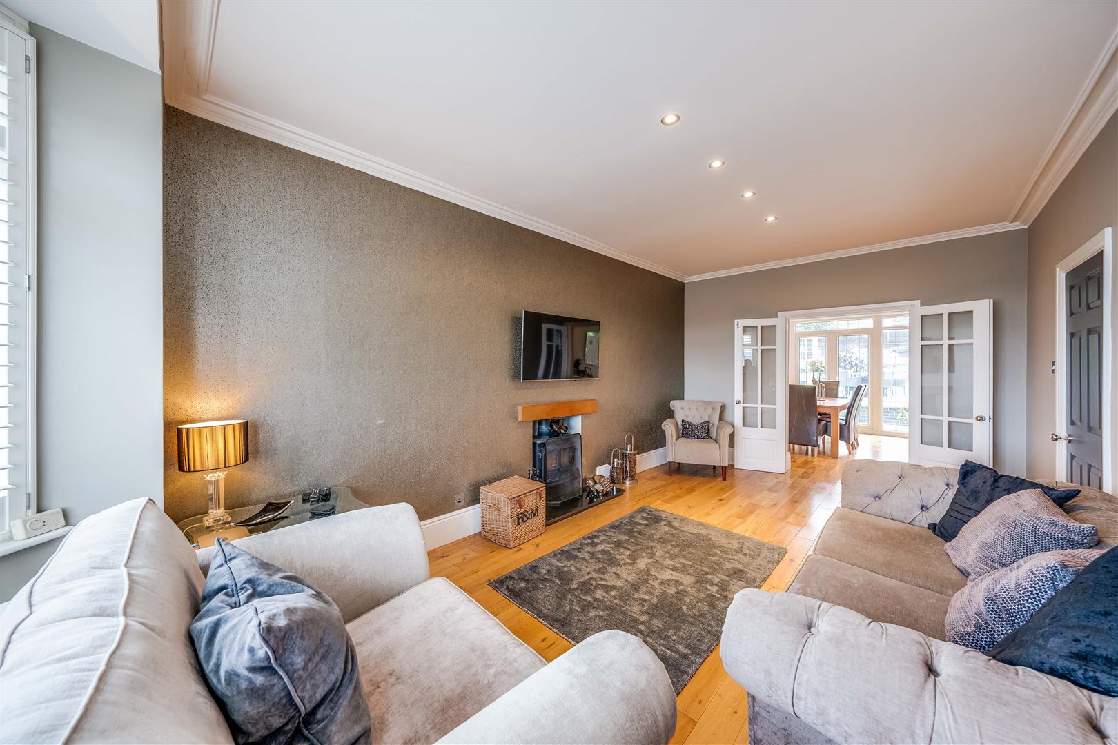The property immediately impresses with its expansive driveway, providing ample parking alongside a double garage. Inside, the welcoming entrance hall leads to well-proportioned and beautifully presented living areas. These include a bright lounge featuring a charming log burner, a formal dining room overlooking the garden, and an additional reception room that offers flexibility for entertaining or relaxing.