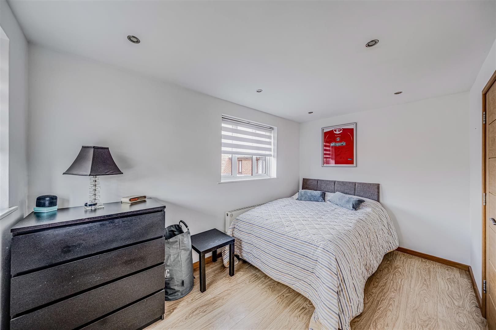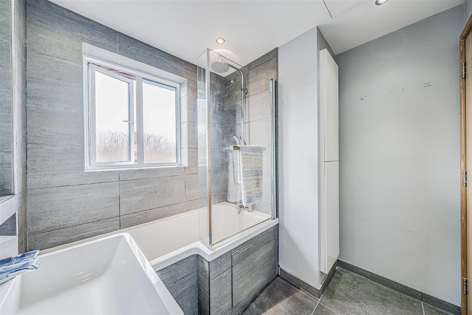 Upstairs, the bedroom is a generous double, with two windows offering good natural light and space for wardrobes and additional furniture. The bathroom is finished to a contemporary standard, featuring full-height tiling, a white suite with a shower over the bath, a modern vanity unit, and a chrome towel radiator.