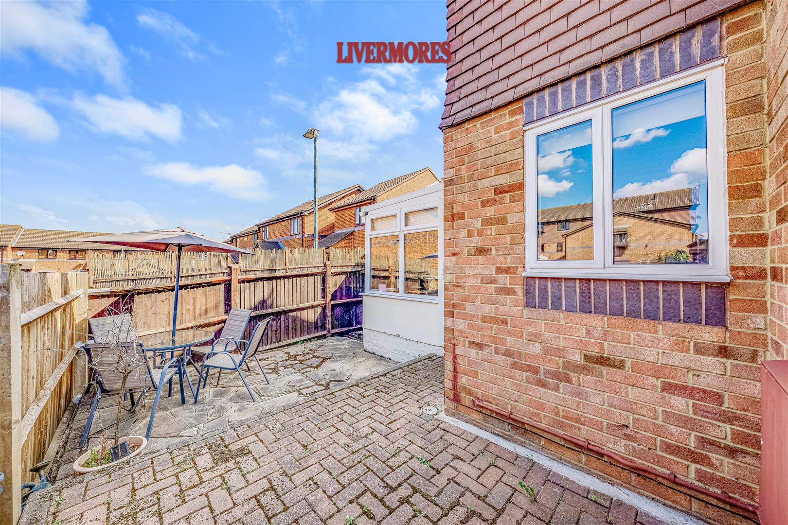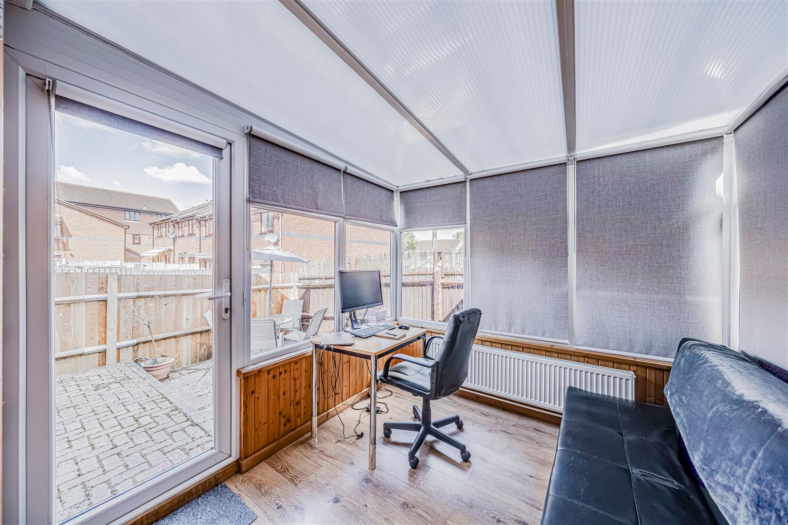 Double doors lead into a conservatory, which adds valuable additional living space. Currently used as a home office, it could also serve as a second sitting area or dining room. This room offers direct access to a private rear patio, providing low-maintenance outdoor space.