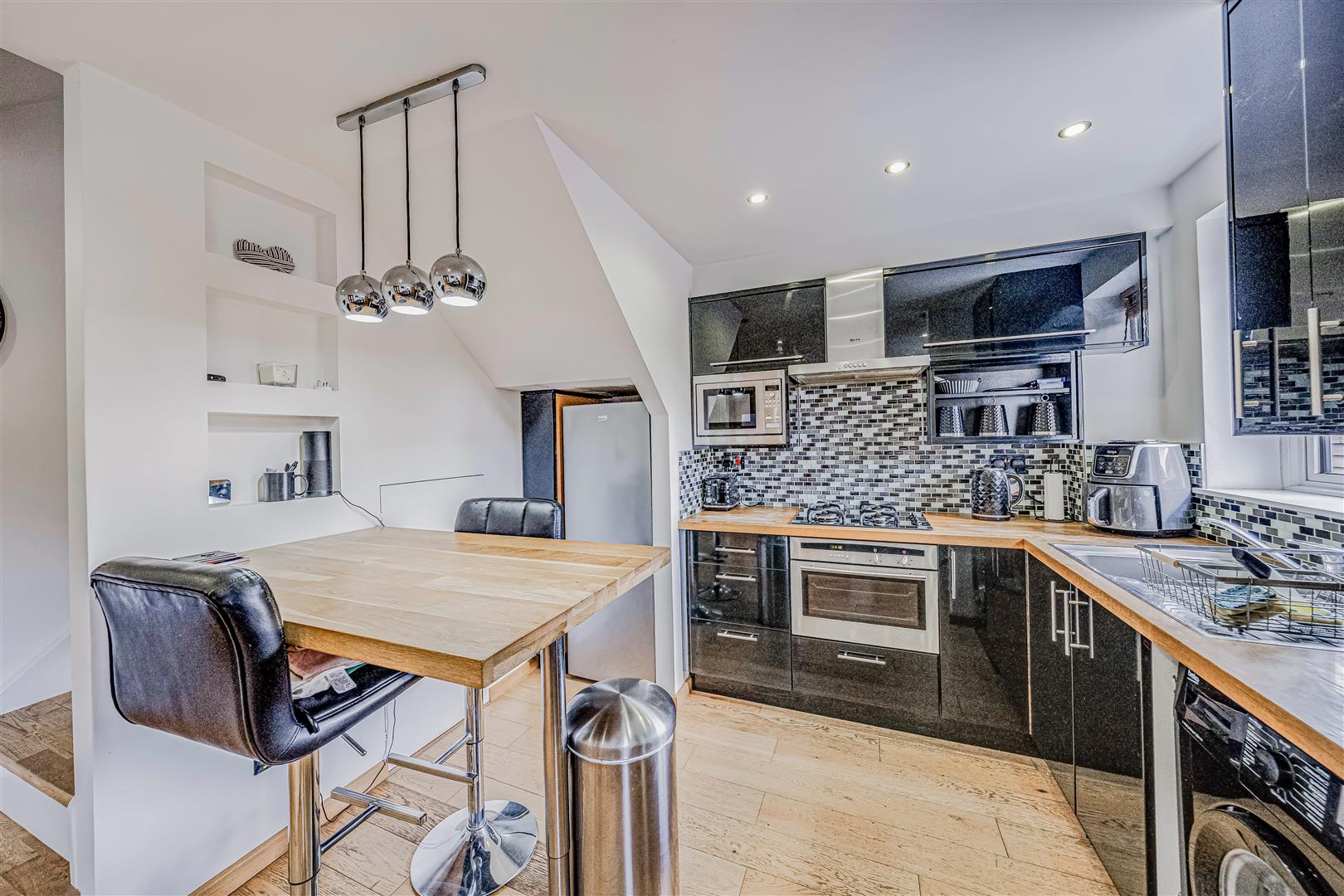 The ground floor comprises a bright, open-plan living and dining area with recessed lighting and neutral décor. The kitchen is well-appointed with gloss black cabinetry, solid wood worktops, integrated appliances, and a tiled splashback. An integrated breakfast bar offers a casual dining space.