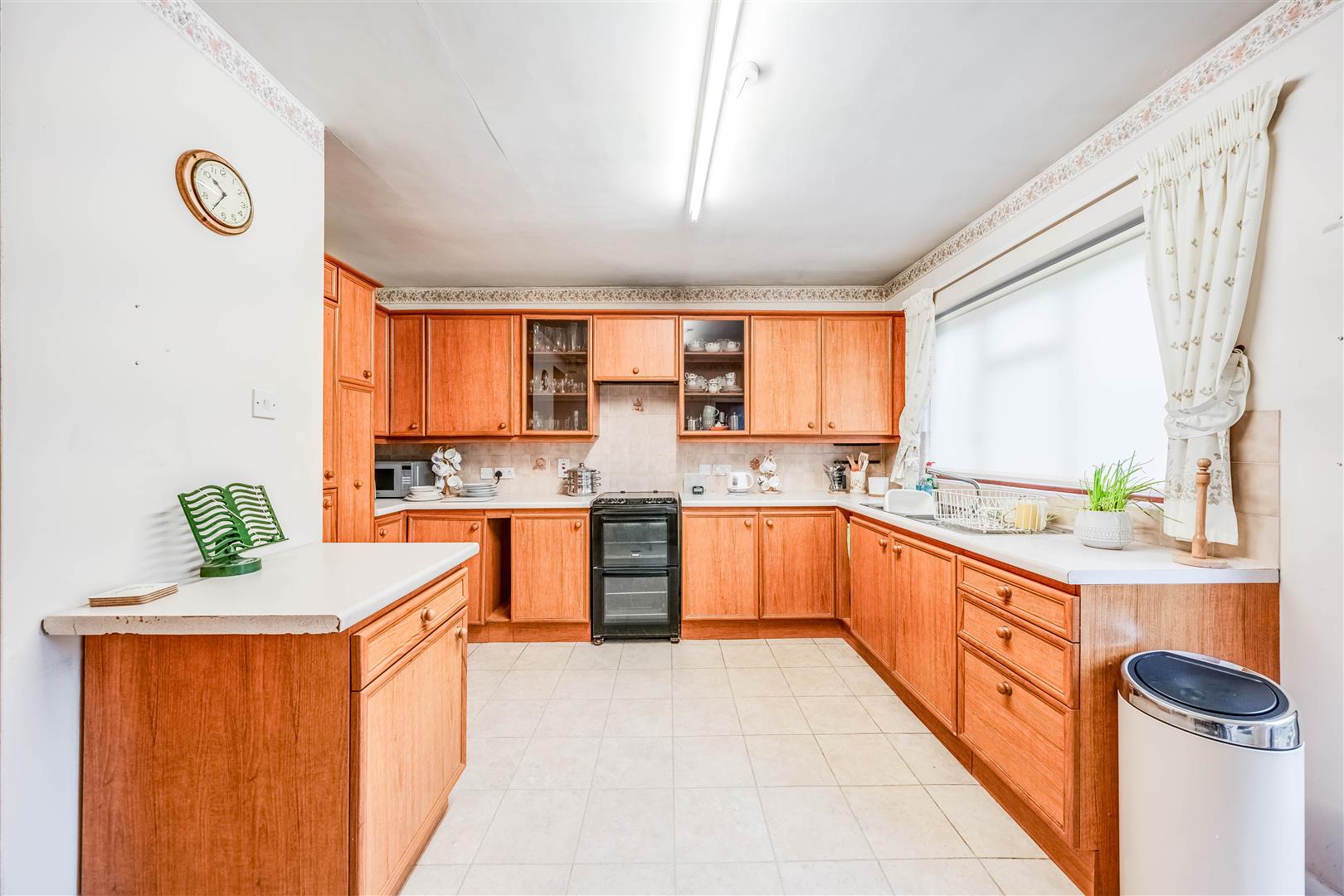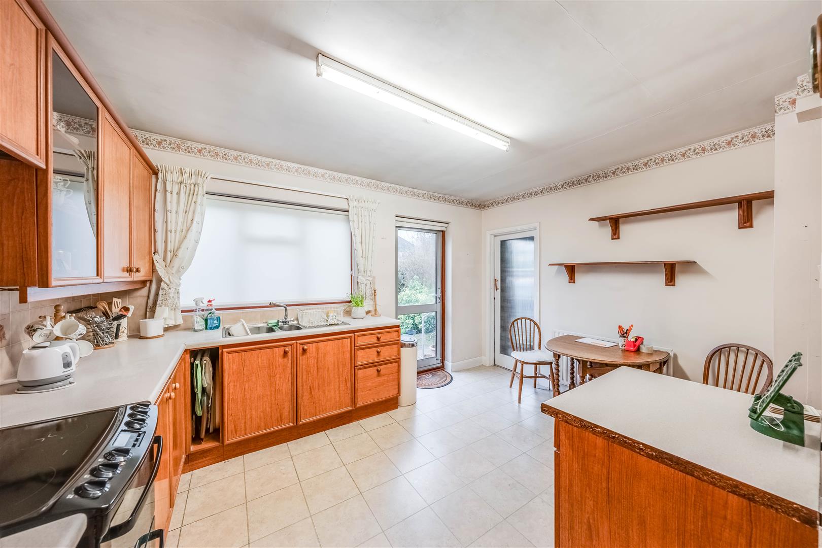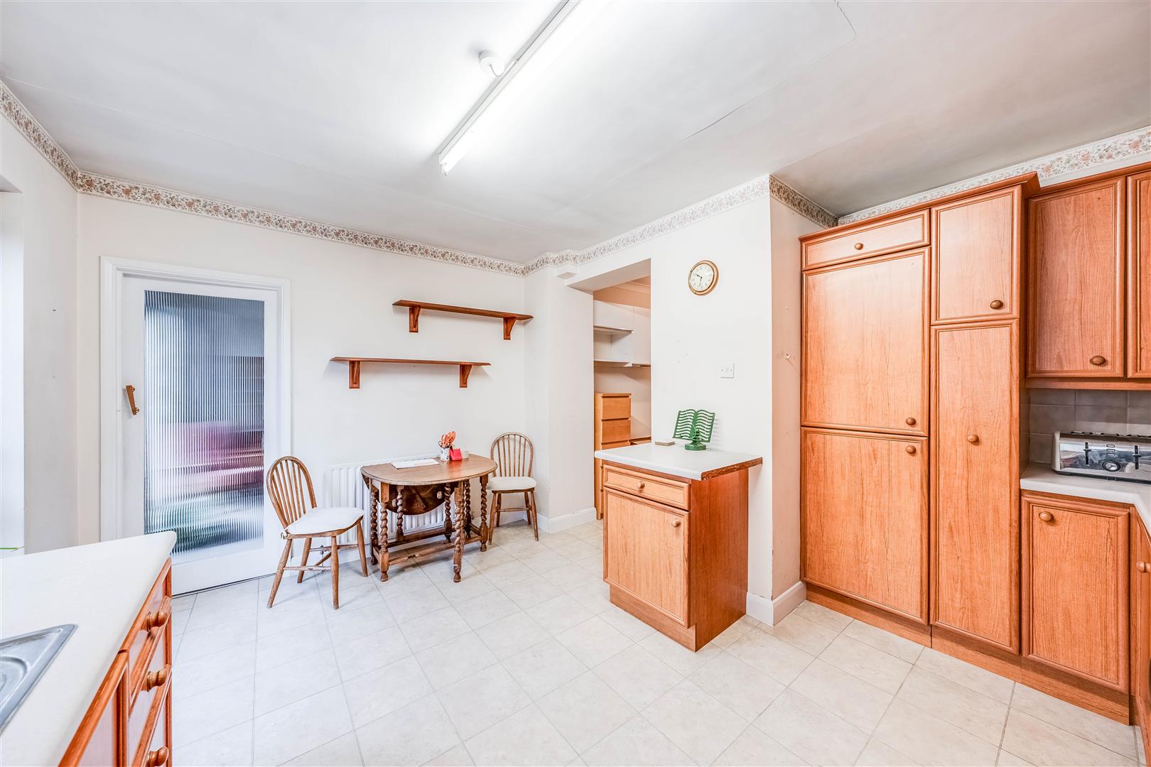 Plumbed for washing machine, wall cupboards, larder cupboard.