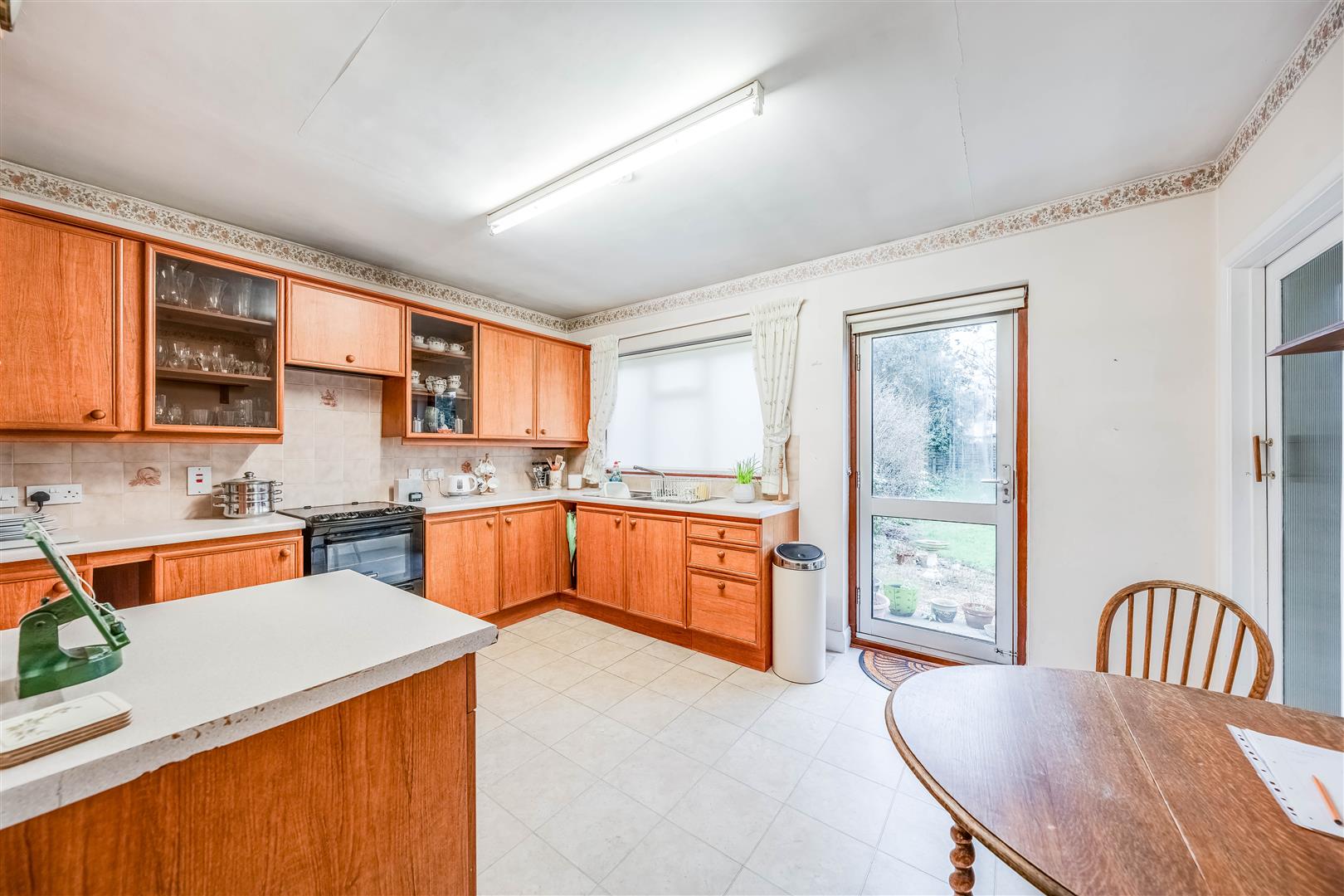 Matching range of wall and base units, integral fridge/freezer, single drainer sink unit with mixer tap, radiator, double glazed window and door to rear.