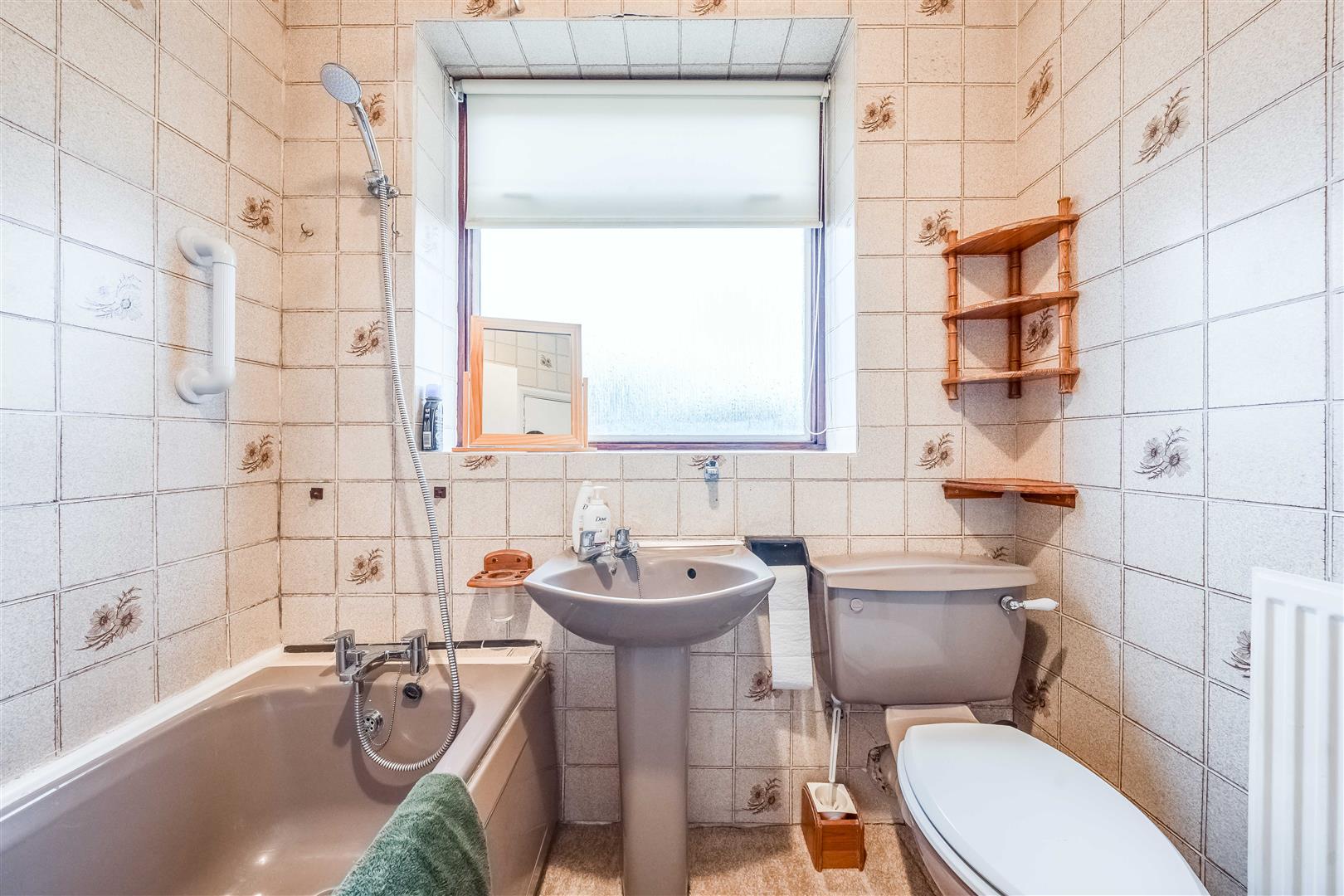 Matching suite comprising enclosed bath with shower mixer tap, rail and curtain, wash hand basin on pedestal, low level WC, tiled walls, carpet, double glazed window to rear.