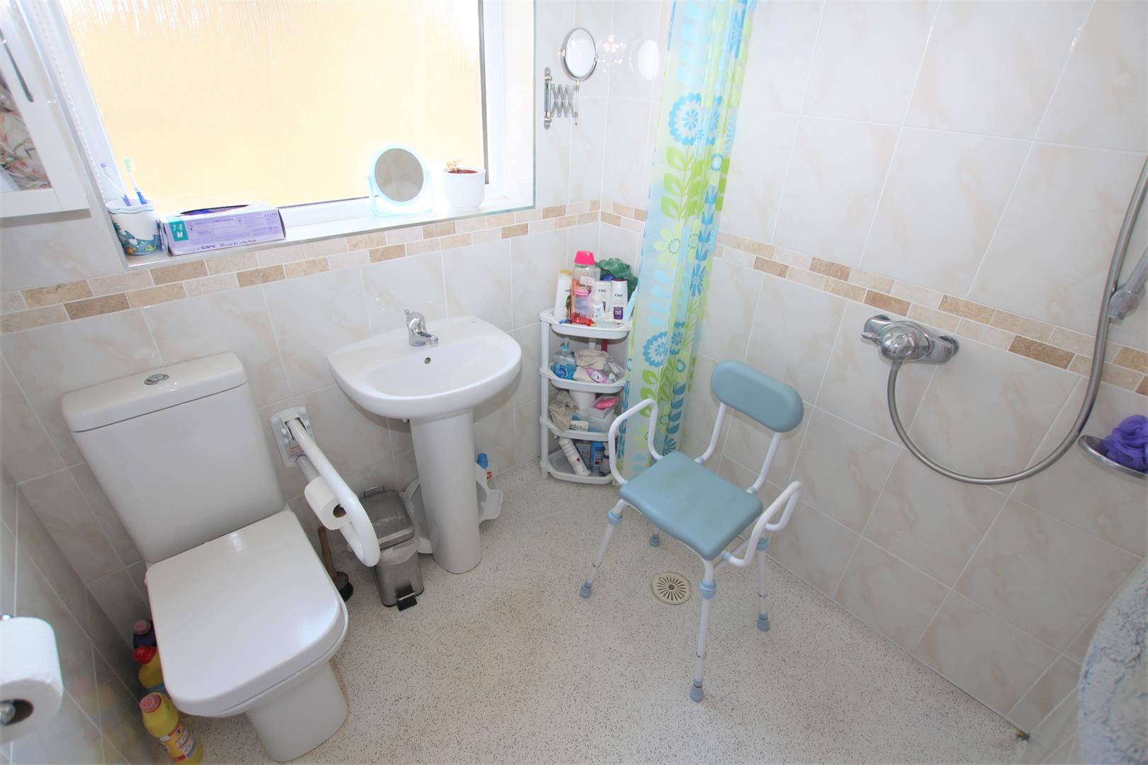 Vinyl flooring, double glazed window to side, chrome heated towel rail, shower, low level WC.