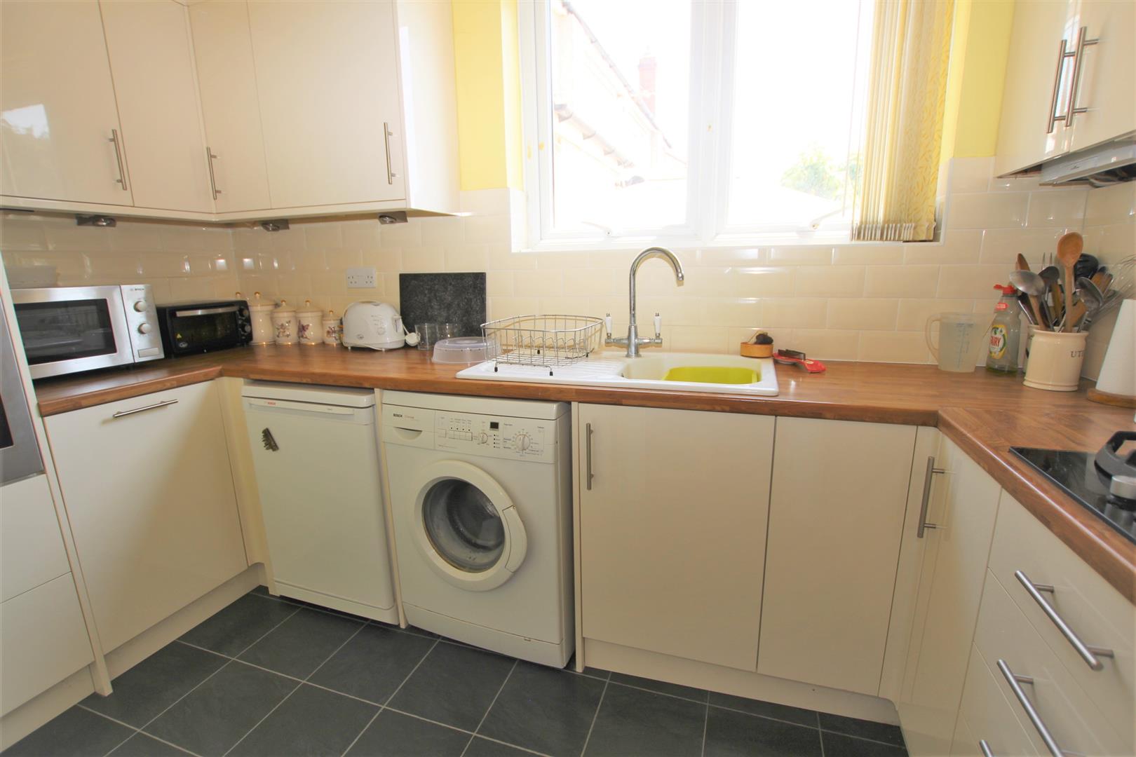 Timber laminate flooring, radiator, double glazed window to side, selection of wall and base units, inset oven & hob, inset ceramic sink with mixer tap, wall mounted gas fired boiler
