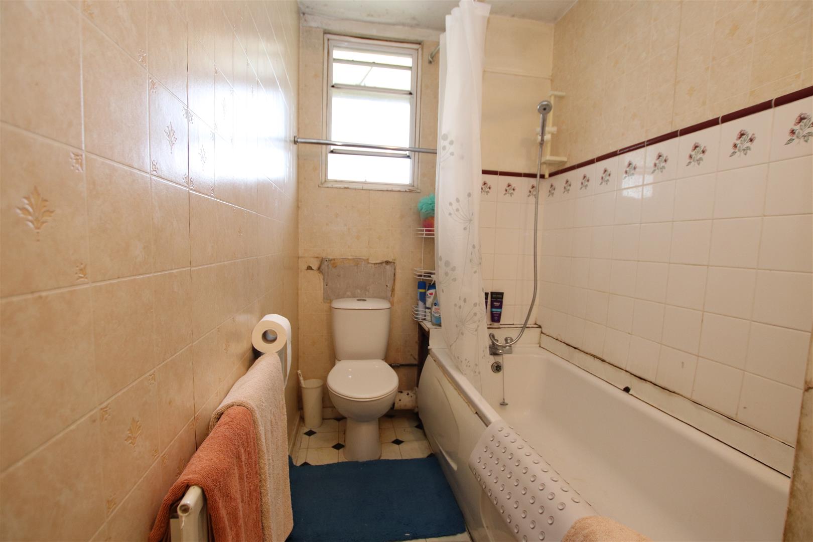 Secondary glazed window to front, panel enclosed bath with mixer tap and shower attachment, pedestal wash hand basin with mixer tap, low level w/c, radiator.