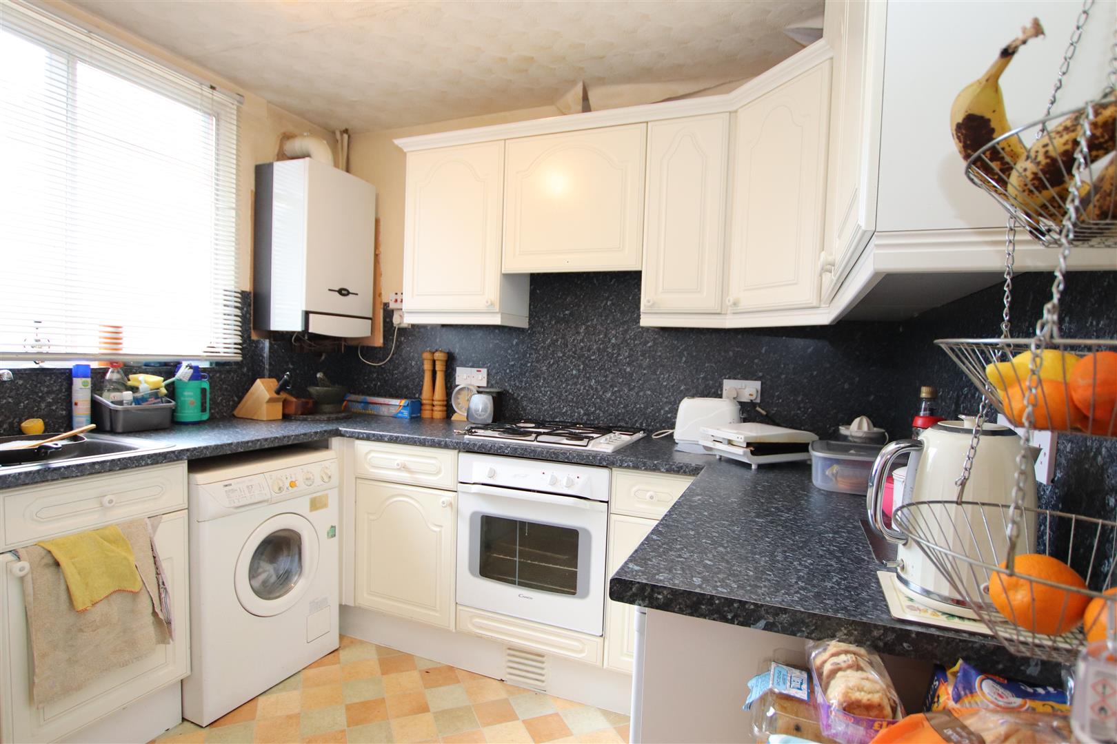 Secondary glazed window to front, wall and base units, work surface, sink unit with mixer tap, built in oven & hob, plumbed for washing machine, wall mounted boiler.