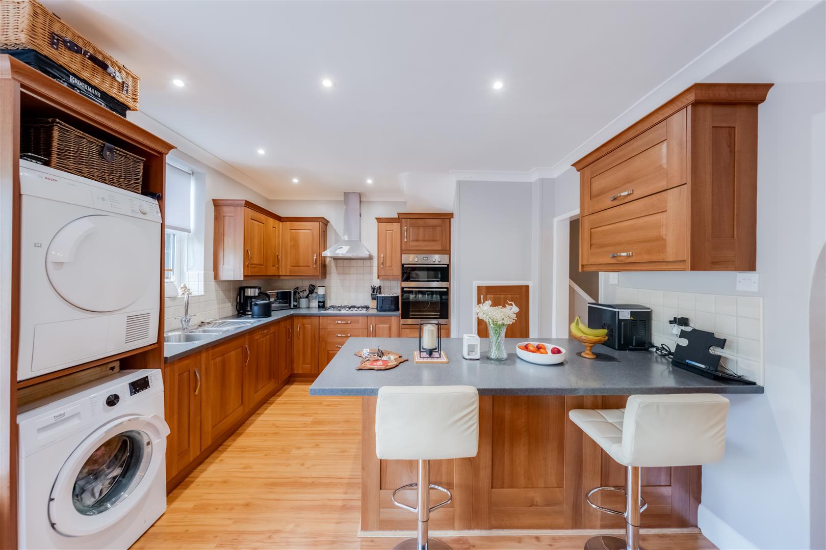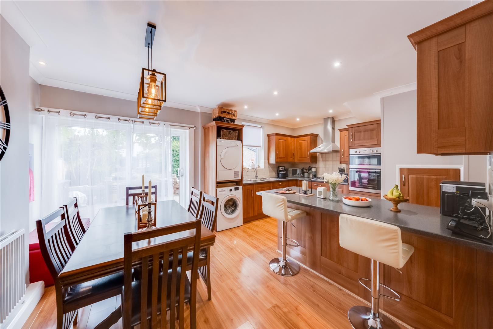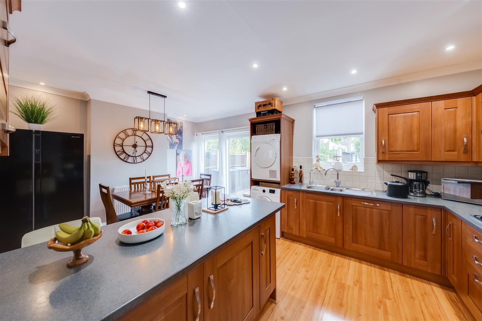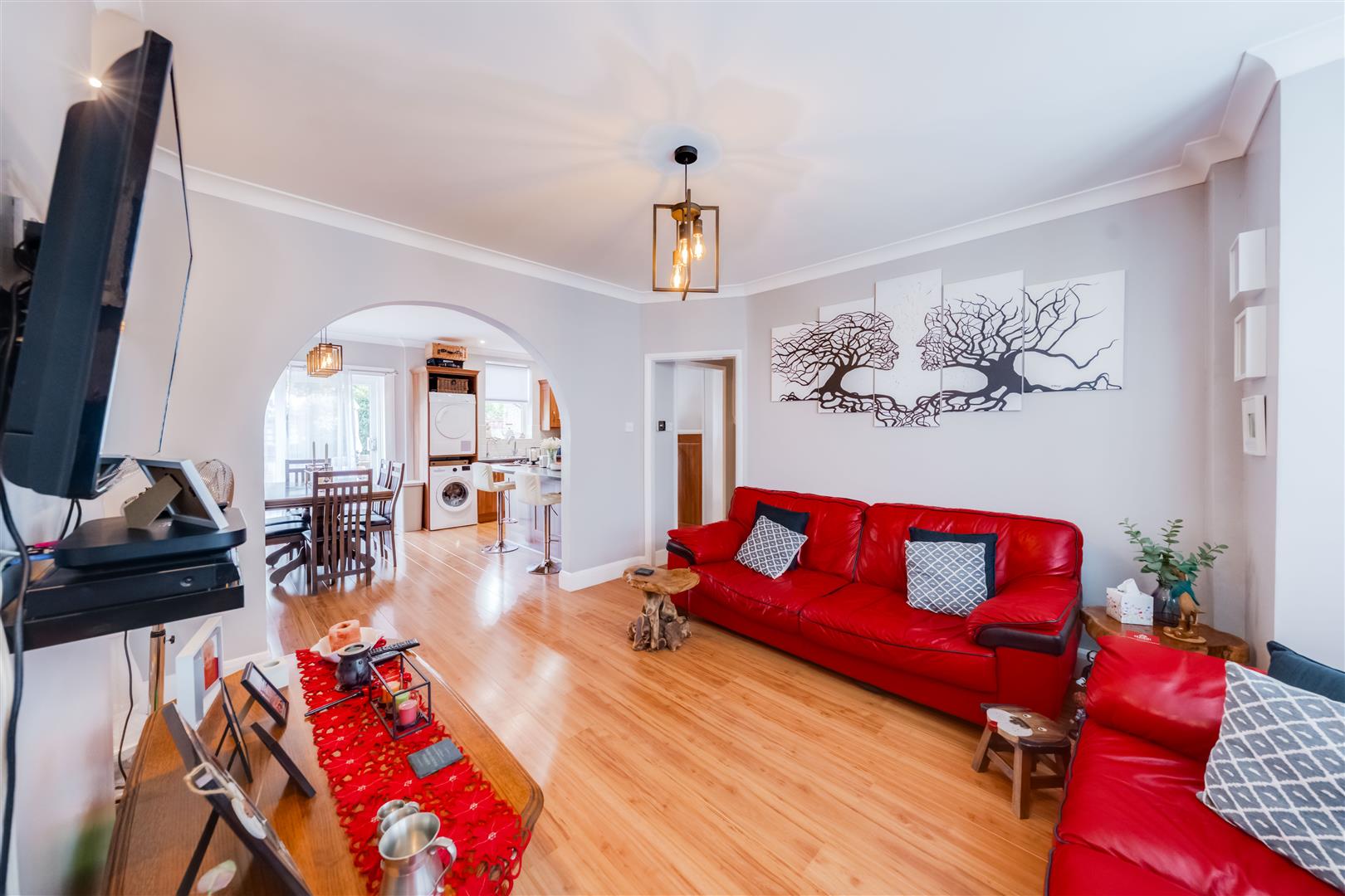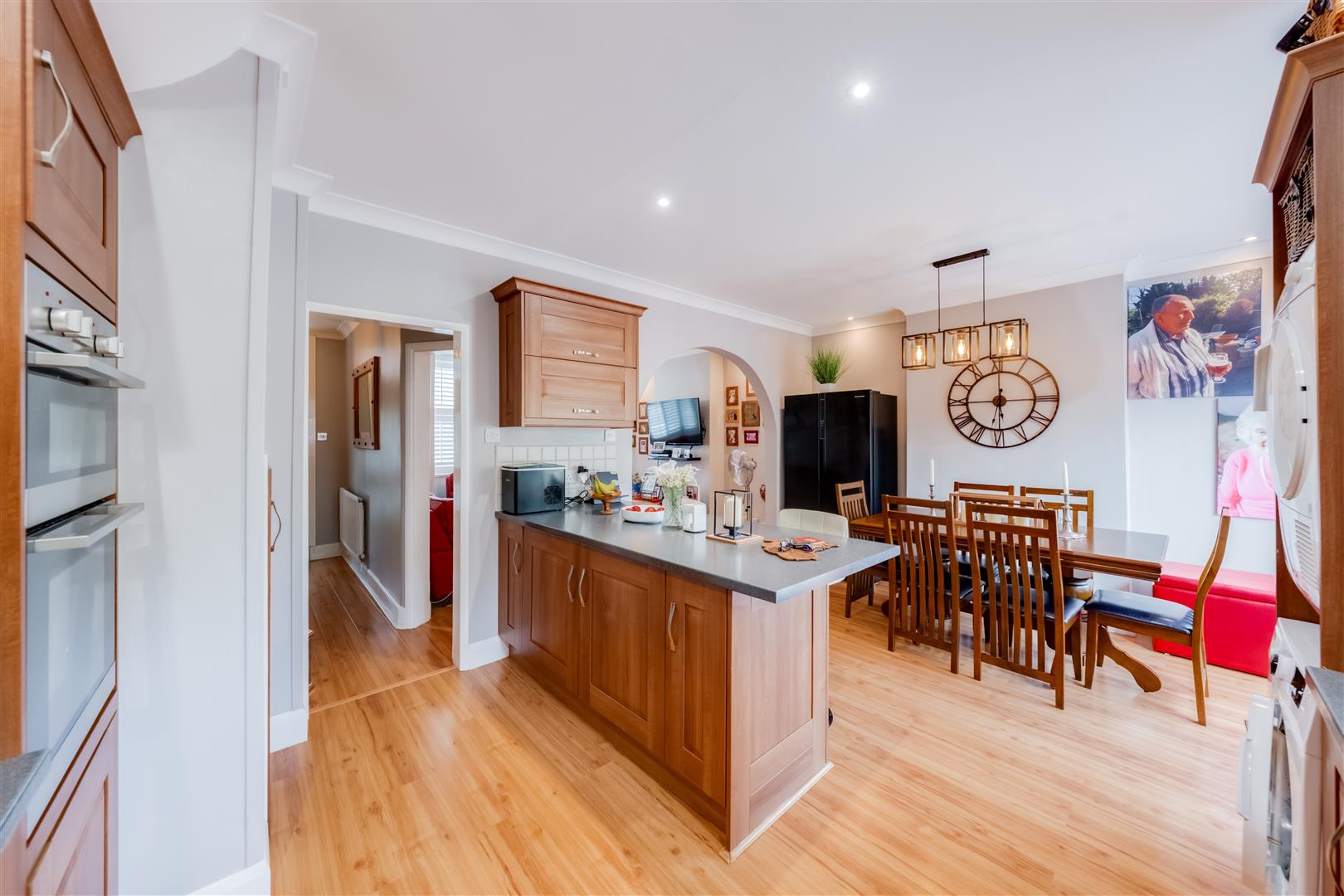 At the heart of this home lies the recently updated kitchen, featuring a stylish breakfast bar. This space is ideal for hosting gatherings, allowing friends and family to gather around while you prepare delicious meals. The kitchen overlooks an impressive rear garden, where children can play freely, making it a perfect setting for family activities and outdoor fun.