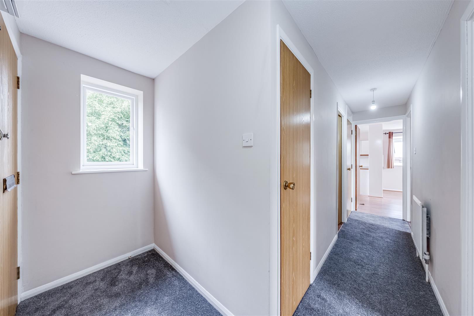 The flat opens into a generous hallway with two large built-in storage cupboards. The main reception room benefits from dual-aspect windows that flood the space with natural light and is finished with attractive wood-effect flooring. A separate kitchen provides a functional layout with plenty of worktop and cupboard space and enjoys pleasant green views.